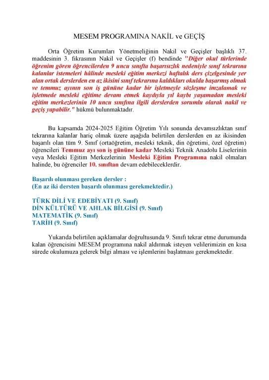 2024-2025 Eğitim Öğretim Yılı sonunda devamsızlıktan sınıf tekrarına kalanlar hariç olmak üzere aşağıda belirtilen derslerden en az ikisinden başarılı olan tüm 9. Sınıf (ortaöğretim, mesleki teknik, din öğretimi, özel öğretim) öğrencileri Temmuz ayı son iş gününe kadar Mesleki Teknik Anadolu Liselerinin veya Mesleki Eğitim Merkezlerinin Mesleki Eğitim Programına nakil olmaları halinde, bu öğrenciler 10. sınıftan devam edebileceklerdir.